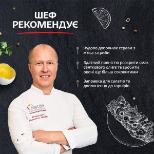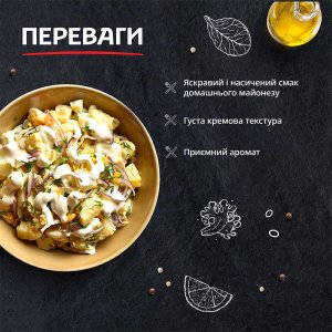 | Склад | олія соняшникова рафінована дезодорована (49,6%), вода питна, цукор, крохмаль модифікований кукурудзяний, оцет спиртовий, сіль кухонна, жовток яєчний ферментований сухий та жовток яєчний сухий (1%), регулятор кислотності (кислота молочна), зерно гірчиці (білої та сарептської), стабілізатор (камедь ксантанова), консервант (сорбат калію), антиоксидант (Е385), барвник (каротини) |