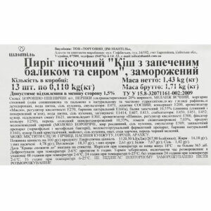 | Склад | борошно пшеничне в/г, вершки 20% жирності, меланж яєчний, перець солодкий швидкозаморожений 10,55%, томати, свіжозаморожені 7,03%, балик запечений 10,55% (свинина), продукт молоко, що містить сирний, цукор білий кристал, сіль кухонна. |