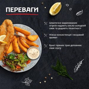 | Склад | вода питна, олія соняшникова рафінована дезодорована (30.1%), огірки мариновані (огірки, регулятор кислотності (кислота оцтова), сіль кухонна), цукор, крохмалі модифіковані кукурудзяні, оцет столовий, овочі сушені (цибуля, часник), зерно гірчиці (1.2%) (білої та сарепської), сіль кухонна, жовток яєчний ферментований сухий, трави пряні сушені (0.3%) (розмарин, петрушка), регулятор кислотності (кислота молочна), консервант сорбат калію), стабілізатор (камедь ксантанова), екстракт кропу, антиоксидант (Е385). |